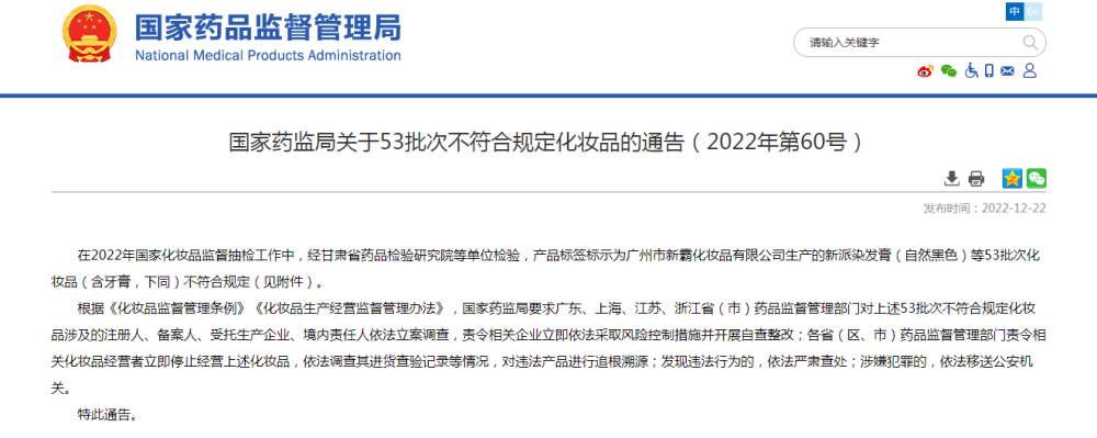 在2022年国家化妆品监督抽检工作中,经甘肃省药品检验研究院等单位检验,产品标签标示为广州市新霸化妆品有限公司生产的新派染发膏(自然黑色)等53批次化妆品(含牙膏,下同)不符合规定(见附件)。