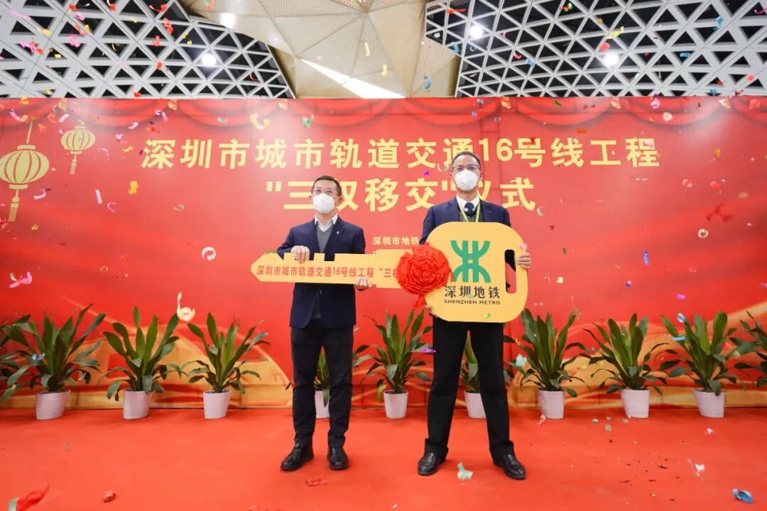 12月20日,深圳地铁16号线“三权移交”仪式在大运中心站顺利举行。仪式上,深铁建设负责人将“金钥匙”传递到深铁运营负责人手中,代表着全线正式由建设阶段转向运营筹备阶段,向着年底高质量开通又迈出了坚实一步。