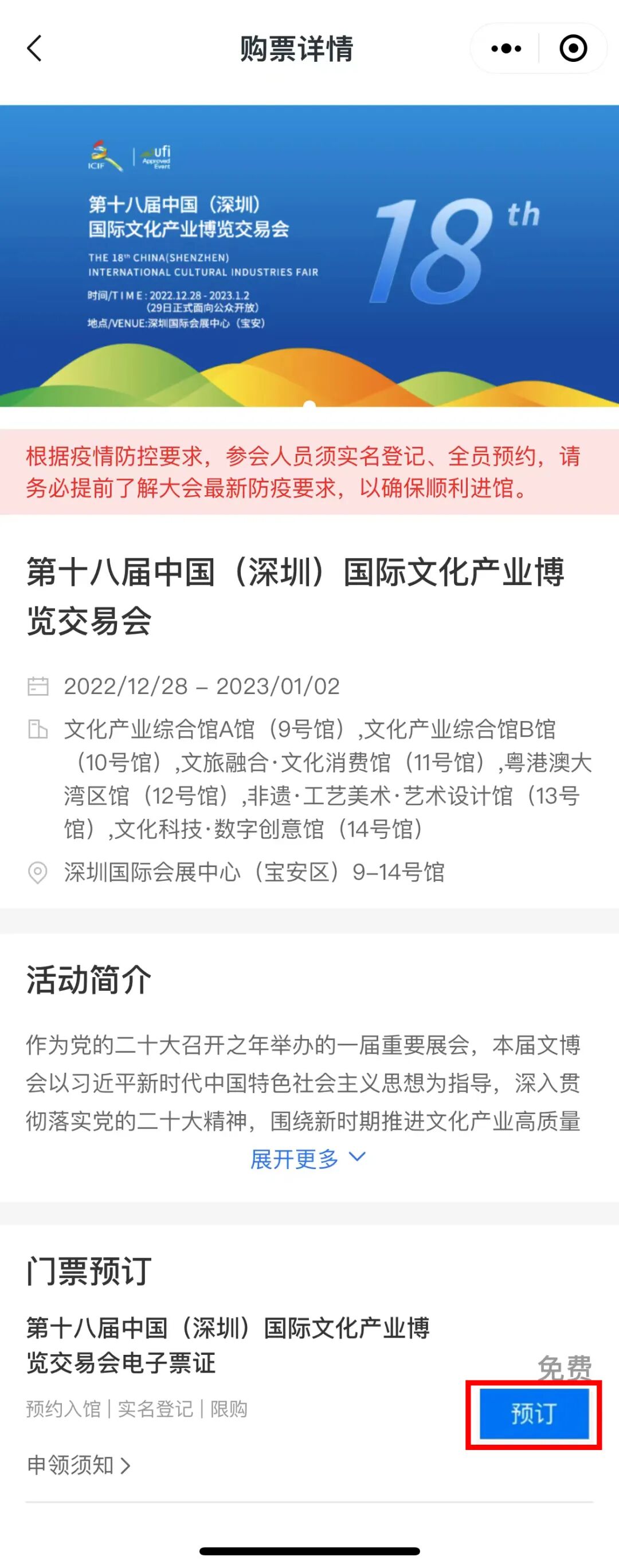 进入购票详情页面,点击【第十八届中国(深圳)国际文化产业博览交易会电子票证】后的【预订】;