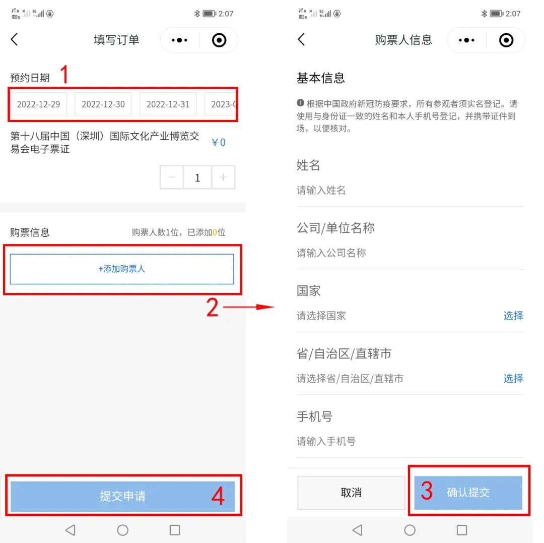 选择预约日期,点击【+添加购票人】,根据实际填写购票人信息,点击【确认提交】→【提交申请】;