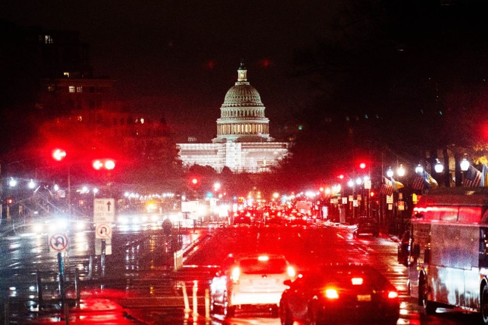 这是12月22日在美国华盛顿拍摄的雨中的车辆和国会大厦。(新华社记者 刘杰 摄)