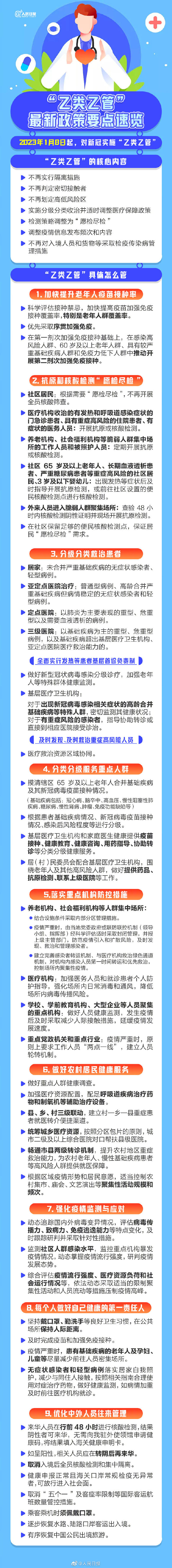 2023年1月8日起,新冠病毒感染将由“乙类甲管”调整为“乙类乙管”。“乙类乙管”的核心内容是什么?具体怎么管?乙类乙管政策要点速览↓↓