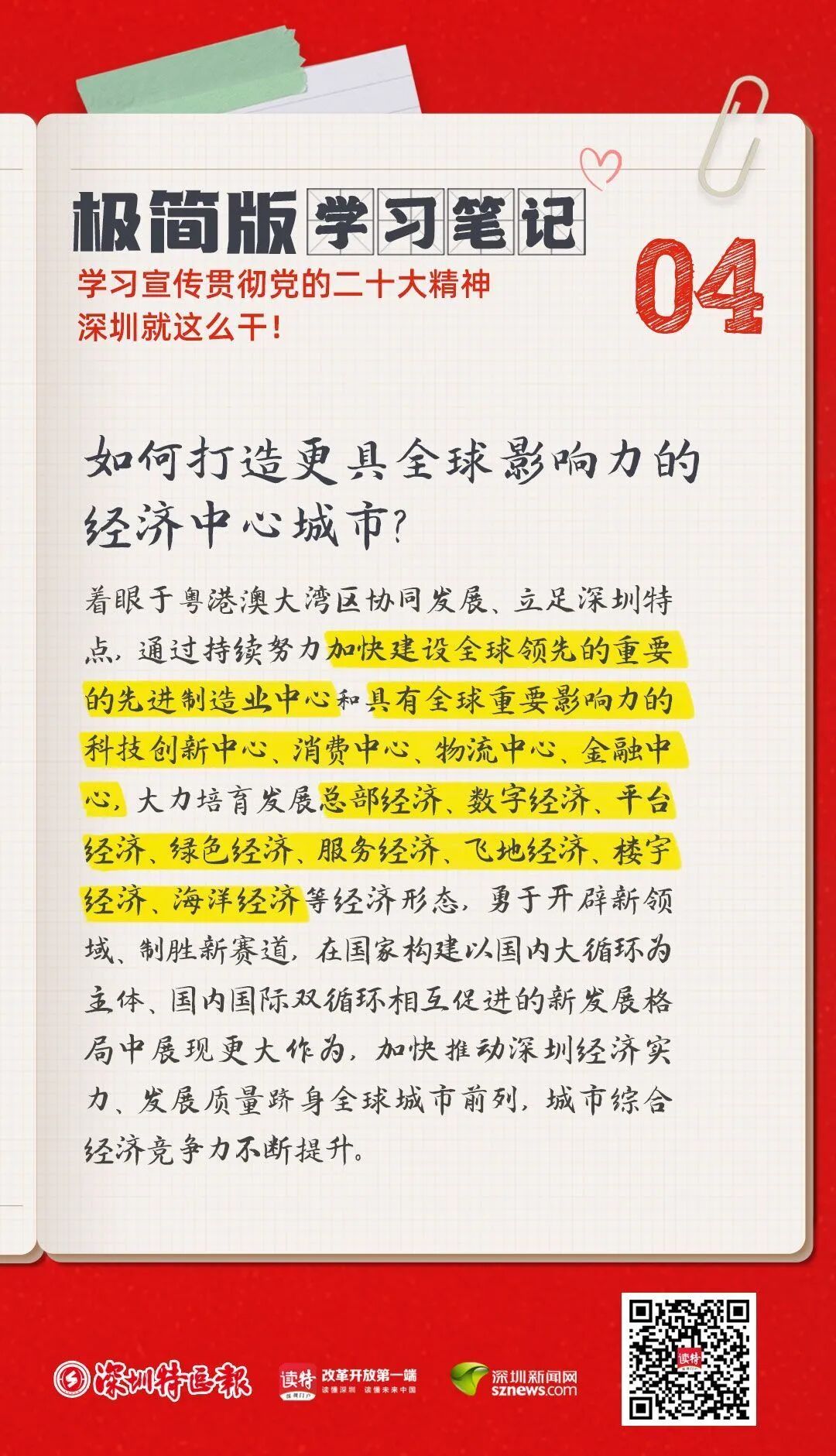聚焦打造更具全球影响力的经济中心城市。着眼于粤港澳大湾区协同发展、立足深圳特点,通过持续努力加快建设全球领先的重要的先进制造业中心和具有全球重要影响力的科技创新中心、消费中心、物流中心、金融中心,大力培育发展总部经济、数字经济、平台经济、绿色经济、服务经济、飞地经济、楼宇经济、海洋经济等经济形态,勇于开辟新领域、制胜新赛道,在国家构建以国内大循环为主体、国内国际双循环相互促进的新发展格局中展现更大作为,加快推动深圳经济实力、发展质量跻身全球城市前列,城市综合经济竞争力不断提升。