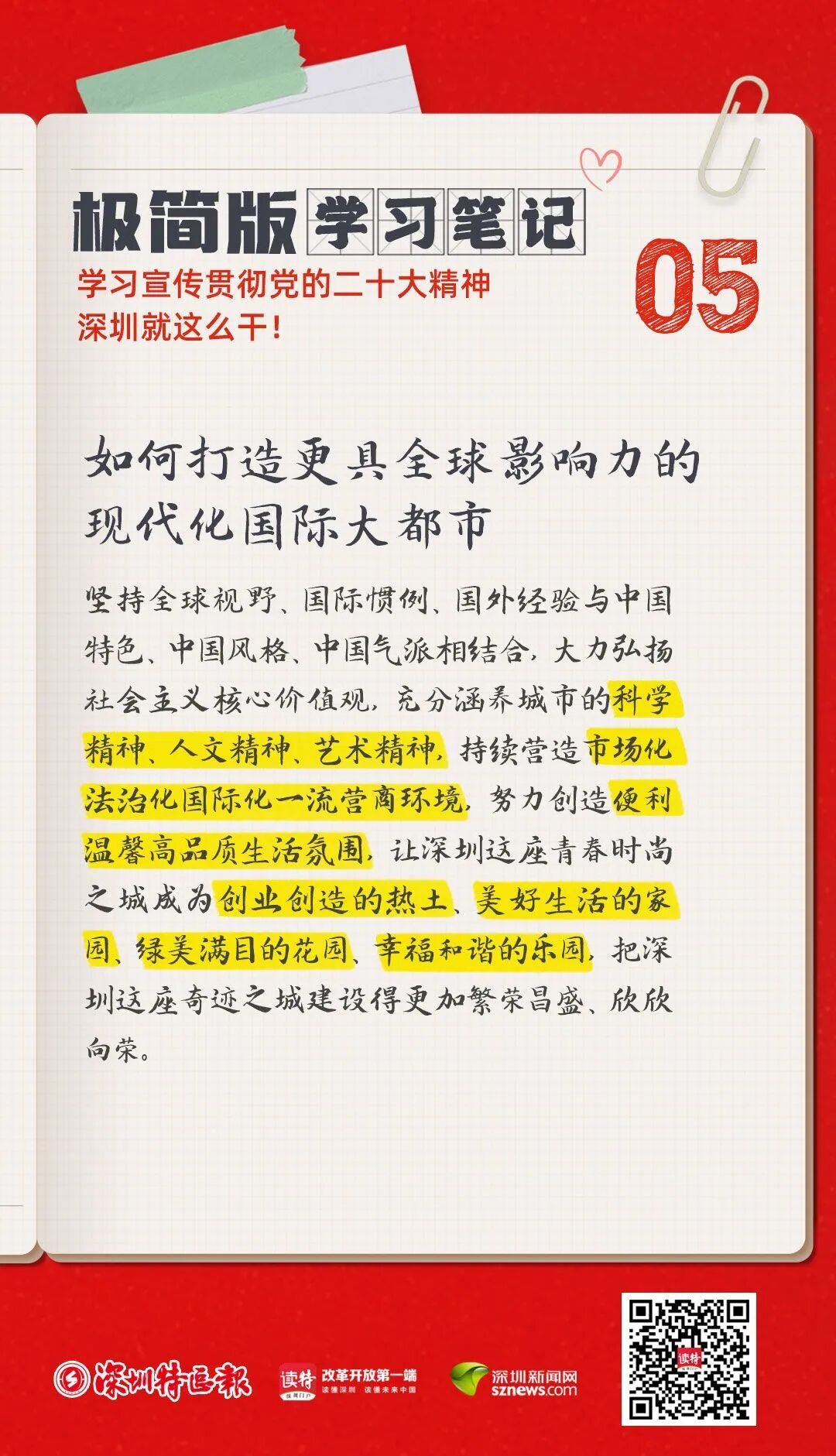 聚焦打造更具全球影响力的现代化国际大都市。坚持全球视野、国际惯例、国外经验与中国特色、中国风格、中国气派相结合,大力弘扬社会主义核心价值观,充分涵养城市的科学精神、人文精神、艺术精神,持续营造市场化法治化国际化一流营商环境,努力创造便利温馨高品质生活氛围,让深圳这座青春时尚之城成为创业创造的热土、美好生活的家园、绿美满目的花园、幸福和谐的乐园,把深圳这座奇迹之城建设得更加繁荣昌盛、欣欣向荣。