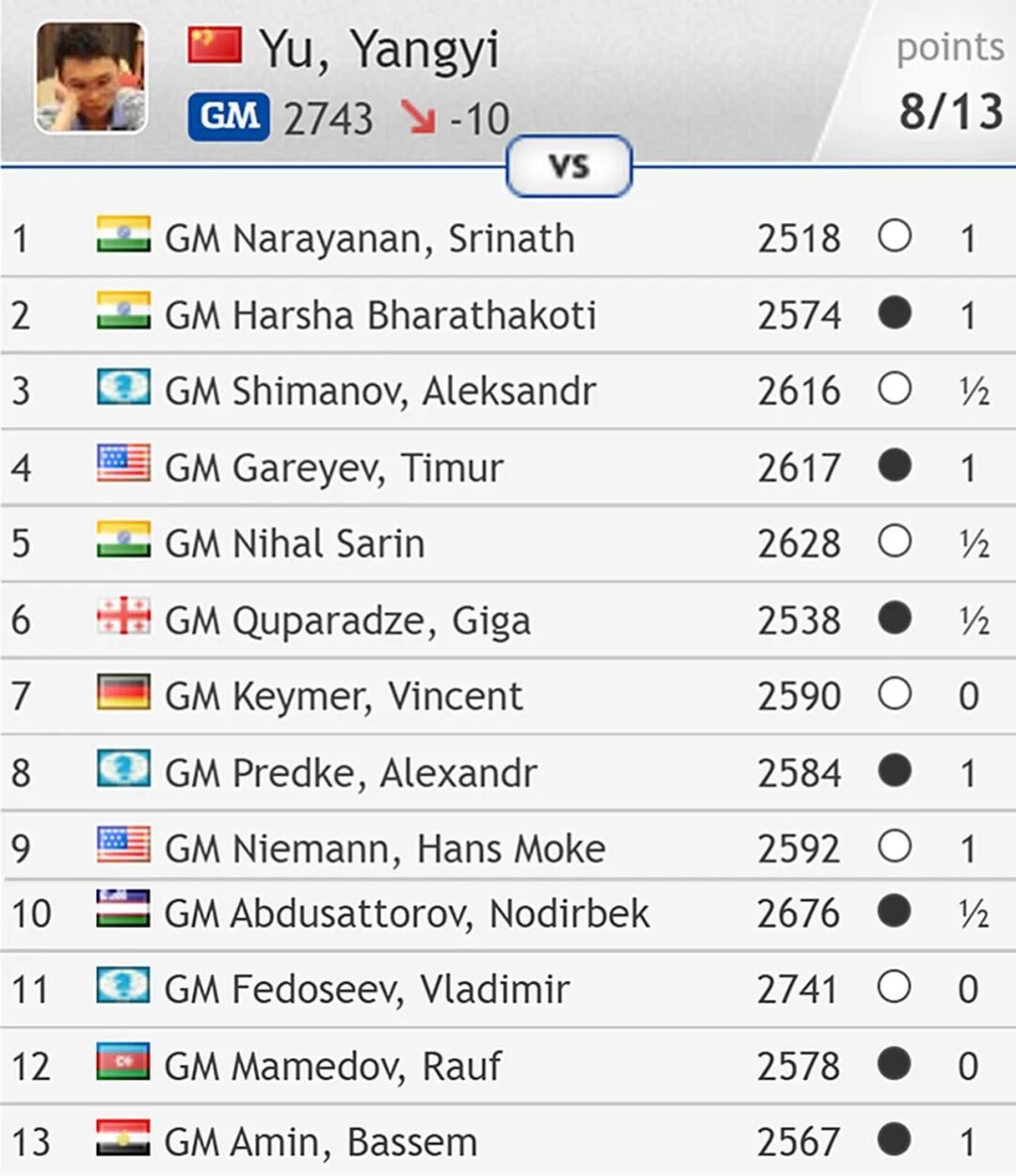 俄罗斯棋手杜波夫、印度棋手埃里加伊斯、俄罗斯棋手费多谢耶夫和阿杰梅耶夫、罗马尼亚棋手拉波尔特同积9分,分列第4~8名。
