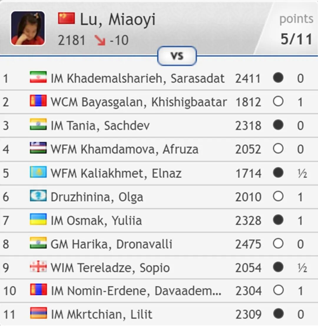 女子组最后一个比赛日进行了第9~11轮比赛。前世界棋后谭中怡在这三轮比赛中取得1胜2和。她先是弈和俄罗斯名将戈尔亚奇金娜,随后战平印度名将科内鲁。收官战,谭中怡仅用30回合,完胜格鲁吉亚棋手巴特西亚什维利。