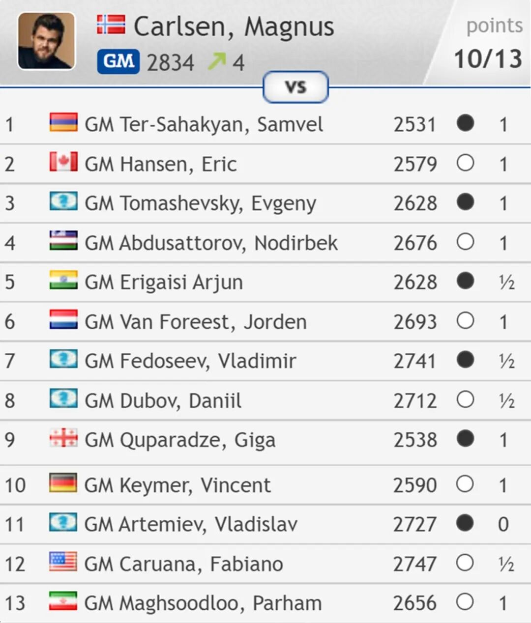 在第10轮击败德国棋手凯默尔之后,卡尔森将领先优势扩大至1分。但第11轮,卡尔森首尝败绩,负于俄罗斯棋手阿杰梅耶夫,积分也被阿杰梅耶夫追平。倒数第二轮,卡尔森弈和老对手卡鲁阿纳。凯默尔战胜维迪特,也将积分追平卡尔森。