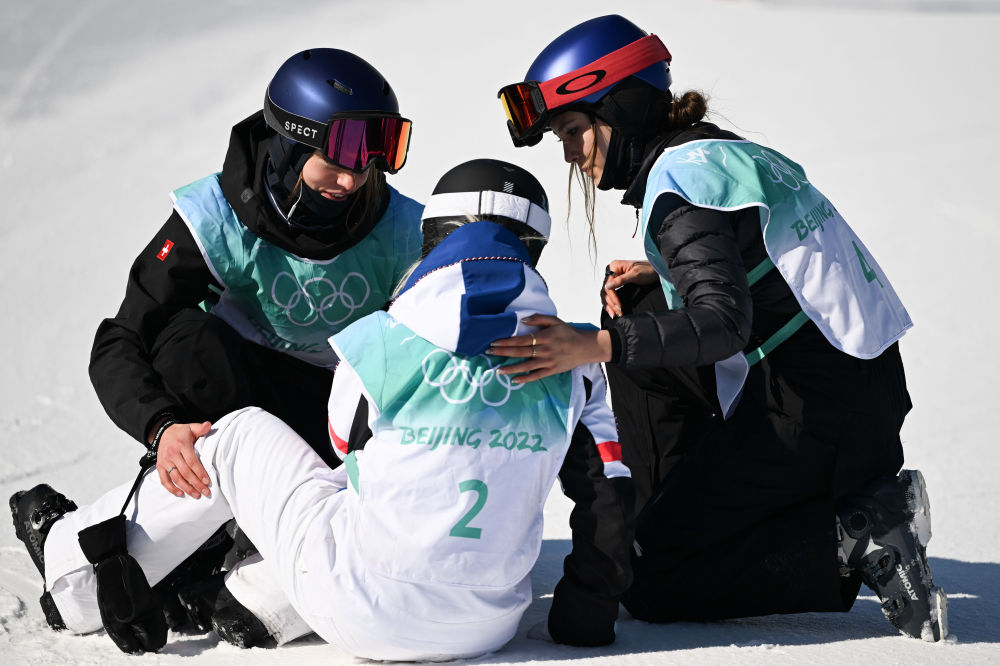 2月8日,中国队选手谷爱凌(右)和瑞士选手玛蒂尔德·格雷莫德(左)在比赛后安慰法国选手泰丝·勒德。新华社记者薛宇舸摄
