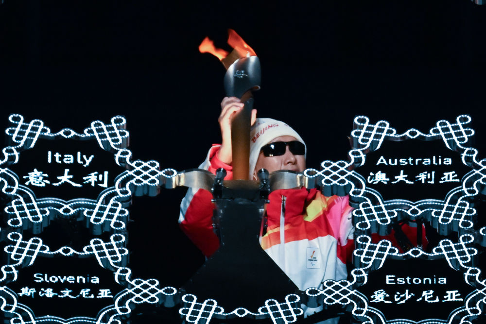 3月4日晚,火炬手李端将火炬嵌入“大雪花”中央。新华社记者李尕摄