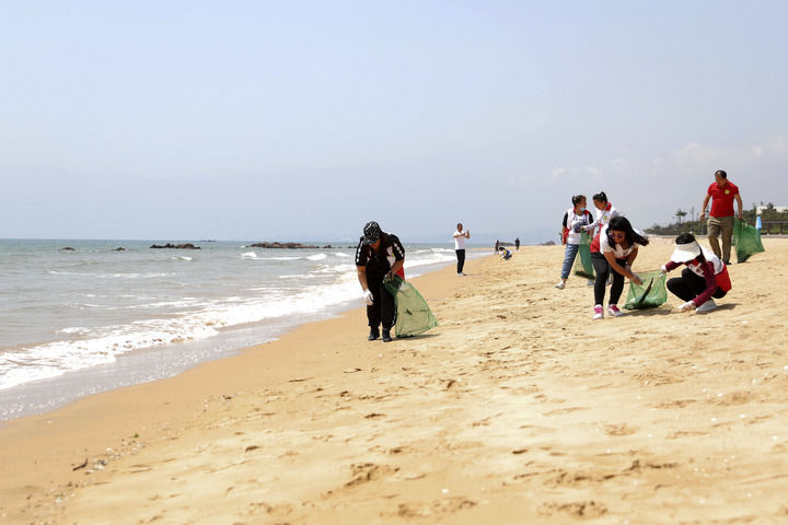 2022年6月8日,青年志愿者在山东省青岛西海岸新区灵山湾海域海滩清理垃圾。 新华社发(王培珂 摄)