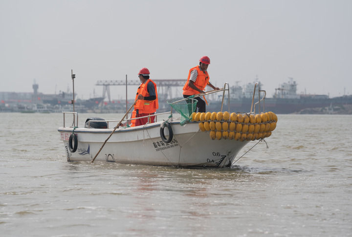 2021年8月9日,河北省黄骅市海上环卫工人在渤海海域清理海漂垃圾。 新华社记者 骆学峰 摄