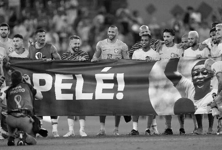 12月5日,参加卡塔尔世界杯的巴西队球员在赛后打出“球王”贝利的横幅。新华社记者陈诚摄