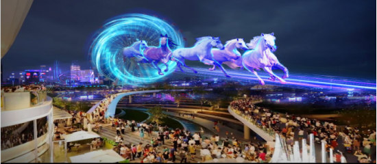 本次深圳宝安元宇宙AR秀活动融合了鲲鹏、梧桐树与凤凰、骏马三大城市IP元素,用光影为画笔,以“欢乐港湾东岸、宝安艺术中心、宝安图书馆、宝安文化中心”等建筑群为卷,借助光的汇聚、影的变幻绘就宝安未来恢宏蓝图。