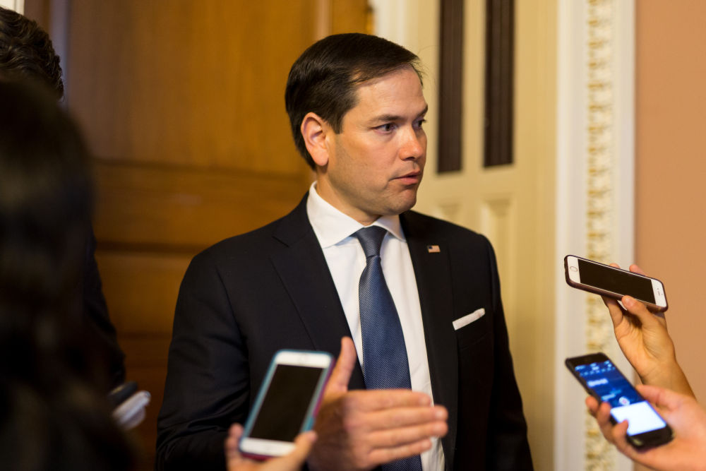 2017年7月13日,在美国华盛顿国会山,参议员鲁比奥出席会议后被记者包围。新华社发(沈霆摄)