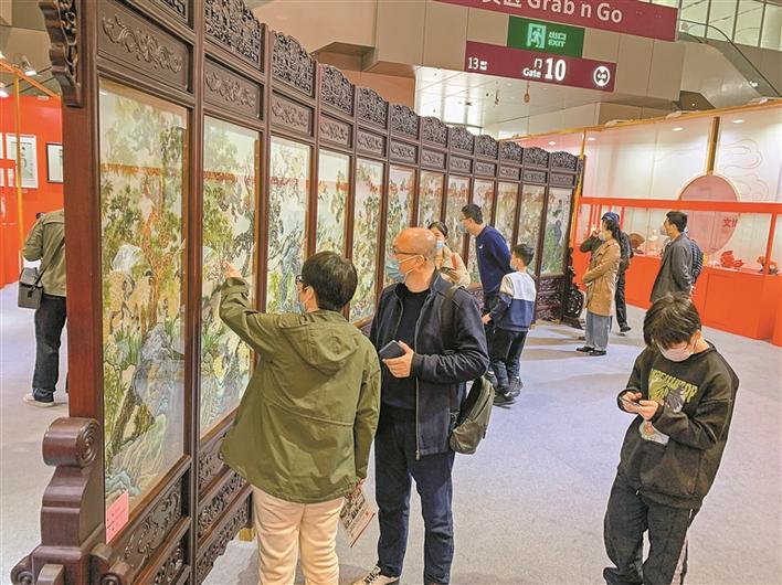 观众参观黄伟雄大师作品珠绣屏风《百鹤图》。 深圳晚报记者 杨慧 摄