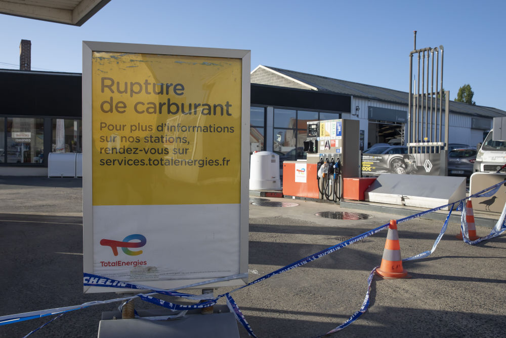这是2022年10月6日在法国北部上法兰西大区莱斯特朗镇拍摄的一处因燃油供应中断而暂时关闭的道达尔集团旗下的加油站。(新华社发,塞巴斯蒂安·库尔吉摄)