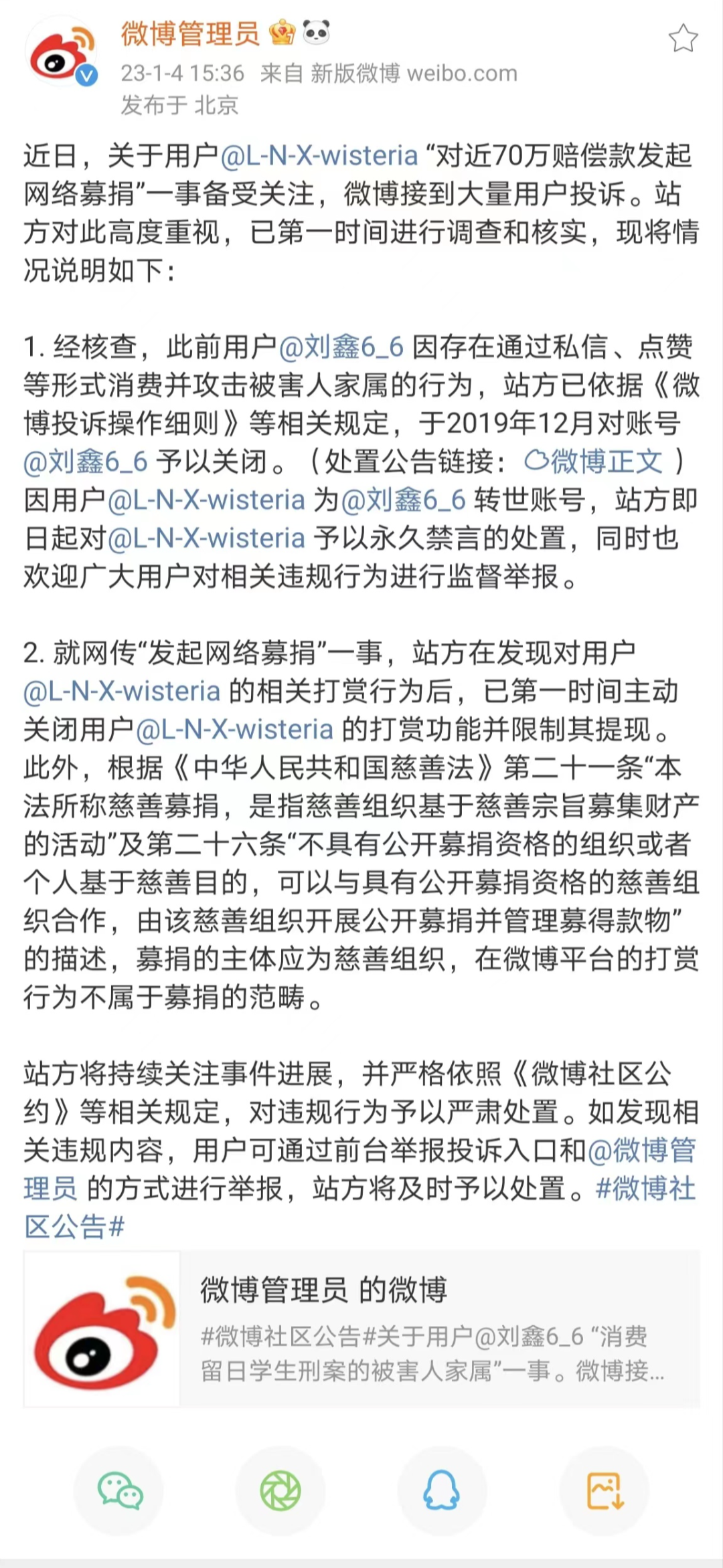 1月4日,“微博管理员”发出说明,刘暖曦大号小号均被“永久禁言”。微博管理员的说明称:近日,关于用户@L-N-X-wisteria “对近70万赔偿款发起网络募捐”一事备受关注,微博接到大量用户投诉。站方对此高度重视,已第一时间进行调查和核实,现将情况说明如下: