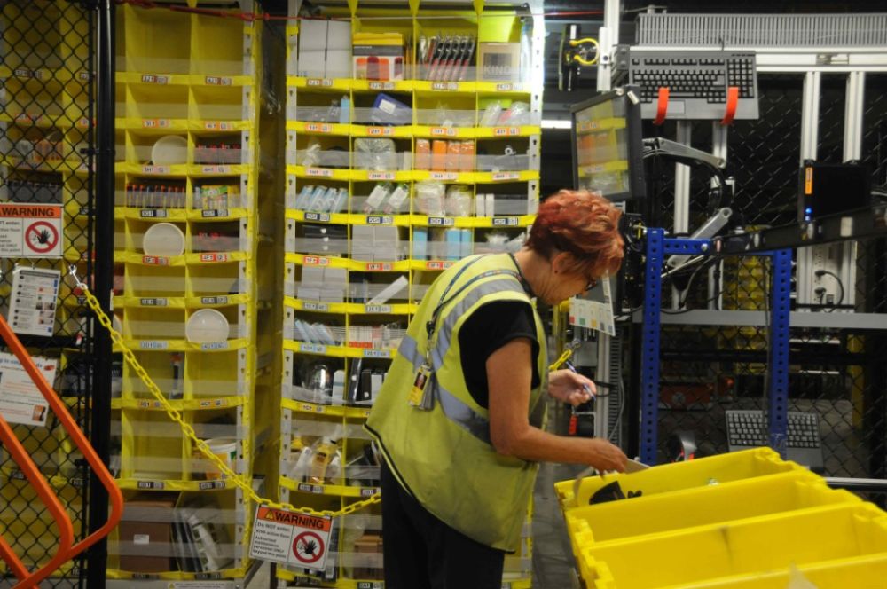 2015年7月16日,在位于美国加州特雷西的亚马逊特雷西运营中心,一名工人根据订单捡货。(新华社记者马丹摄)