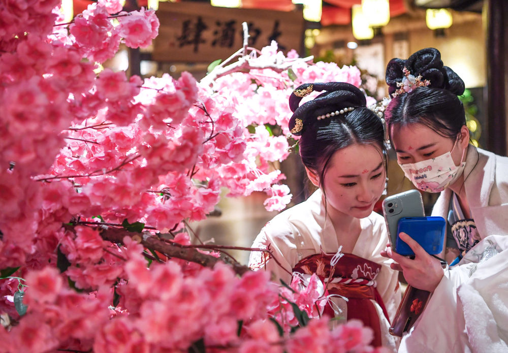 2022年12月31日,游客在长安十二时辰主题街区游玩拍照。岁末年初,西安大唐不夜城、长安十二时辰等景区游人如织。不少市民游客选择在元旦假期出游迎新,与亲朋好友共享节日喜乐。新华社发(邹竞一摄)