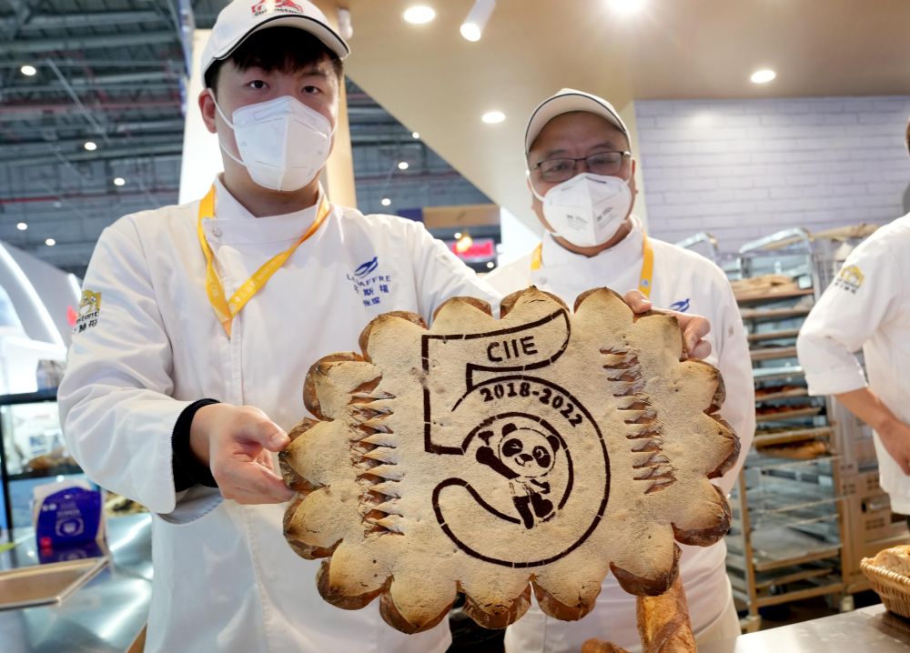2022年11月7日,第五届进博会乐斯福展台的烘焙师展示为进博会特制的法式面包。在第五届中国国际进口博览会的食品及农产品展区,汇聚了世界各地的特色物产和美食,令人目不暇接。新华社记者 刘颖 摄