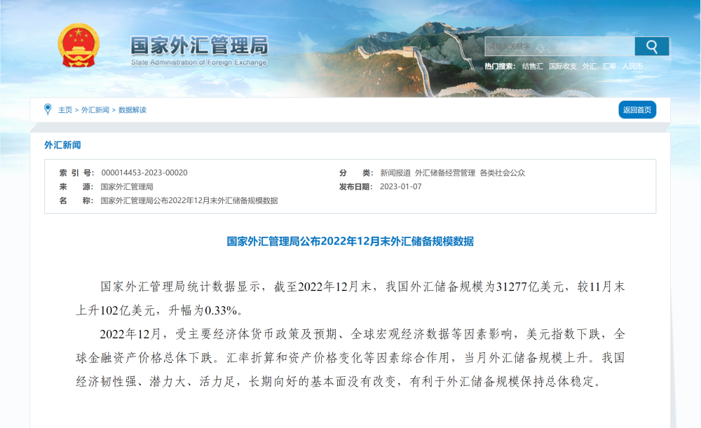 国家外汇管理局公布2022年12月末外汇储备规模数据
