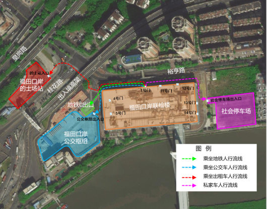 旅客出联检大楼1号门后,沿裕亨路往西过2次斑马线到达桂花路北侧,沿桂花路继续西行至福田口岸的士场站。