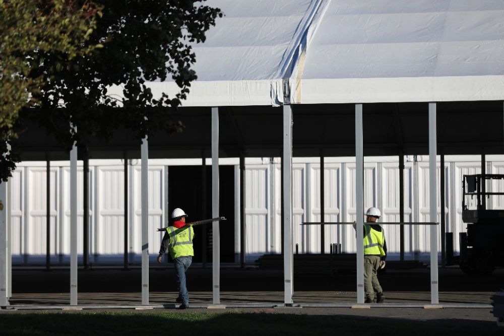 2022年10月9日,工人在位于美国纽约市兰德尔岛的移民救援中心建设工地工作。新华社记者王迎摄