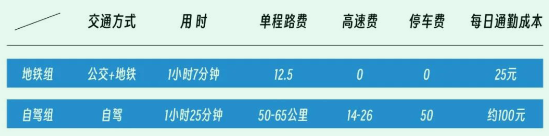 从费用上看,地铁组是完胜的。公交3元,地铁9.5元,加在一起12.5元,每天的通勤成本是25元,无其他支出。