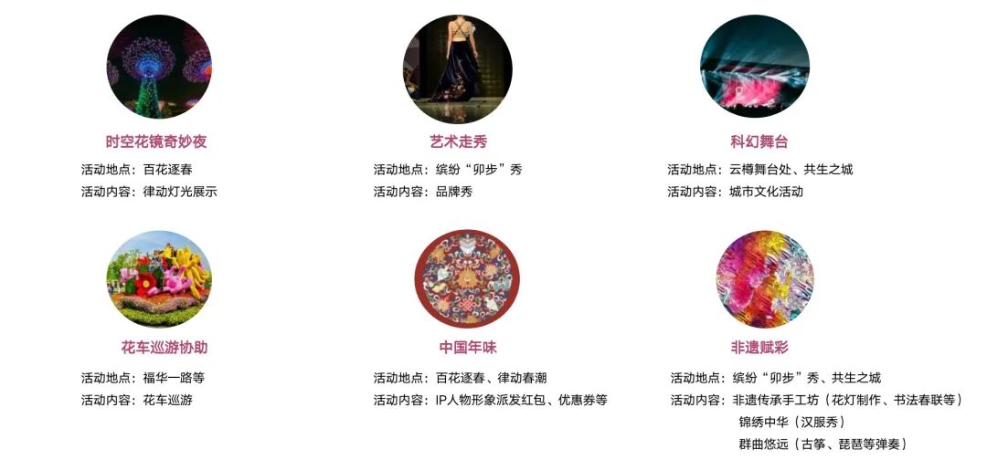 时空花镜奇妙夜、艺术走秀、花车巡游、非遗赋彩…