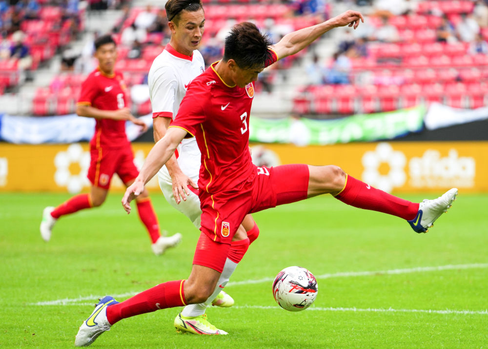 7月27日,中国国家男子足球选拔队球员吴少聪(右)在2022东亚杯比赛中防守中国香港队球员安永佳。新华社记者 张笑宇 摄