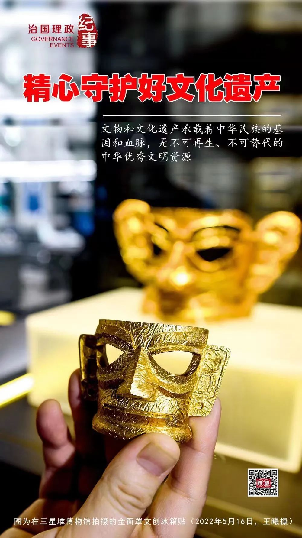 2022年5月27日,中共中央总书记、国家主席、中央军委主席习近平在主持中共中央政治局第三十九次集体学习时强调,文物和文化遗产承载着中华民族的基因和血脉,是不可再生、不可替代的中华优秀文明资源。要让更多文物和文化遗产活起来,营造传承中华文明的浓厚社会氛围。要积极推进文物保护利用和文化遗产保护传承,挖掘文物和文化遗产的多重价值,传播更多承载中华文化、中国精神的价值符号和文化产品。