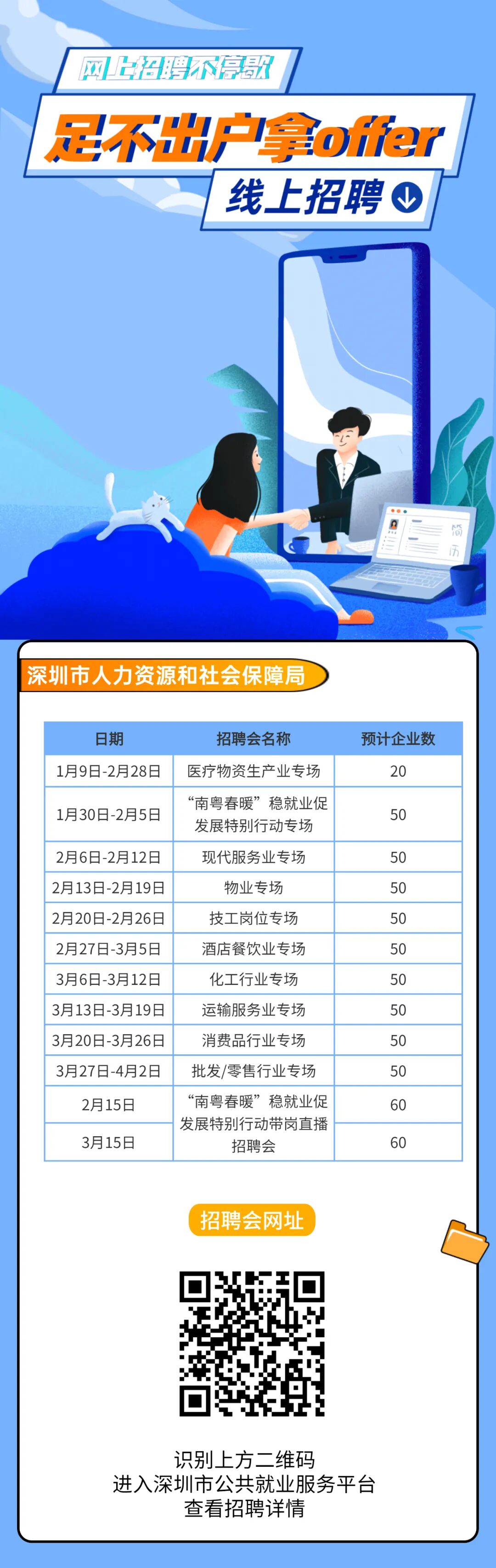 记者从深圳市人力资源和社会保障局获悉,春节假期过后,将是求职招聘的高峰期。市、区人社部门将在春节后,组织各行业有用工需求的企业,举办高频多点的线下招聘活动,开展直播带岗、云招聘等线上招聘活动。2023年1月-3月期间,全市计划开展招聘活动208场次,其中线上111场次,线下97场次,超5000家企业抛出招聘橄榄枝。