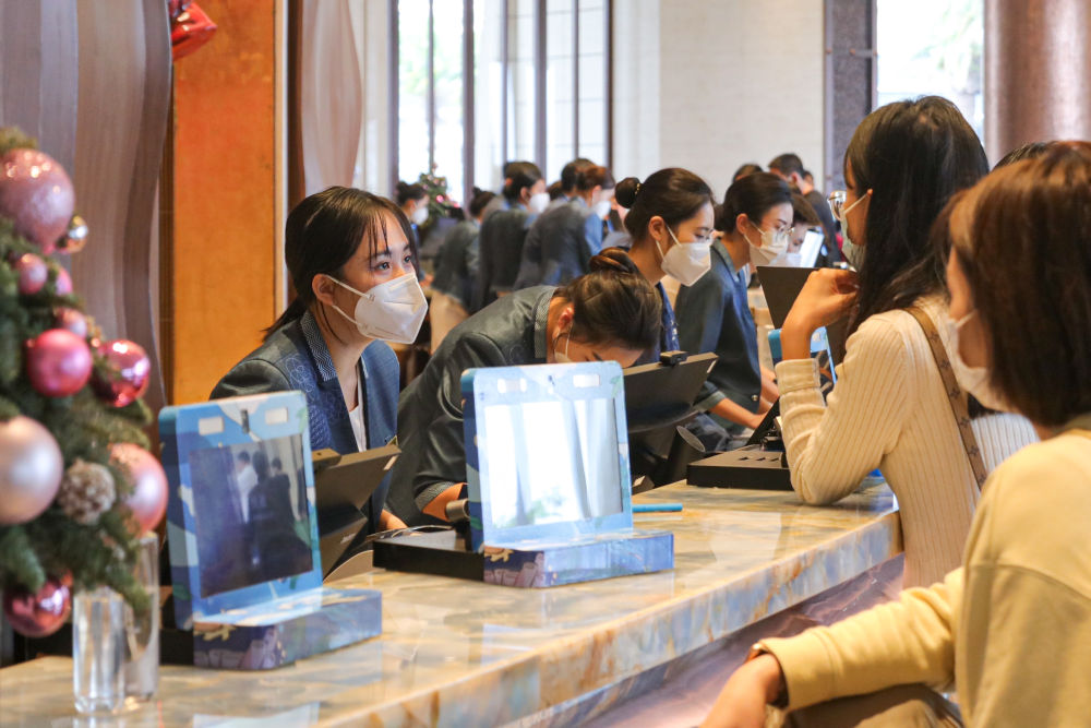 在海南三亚亚特兰蒂斯酒店,前台工作人员为游客办理入住手续(2022年12月29日摄)。新华社发(王学 摄)