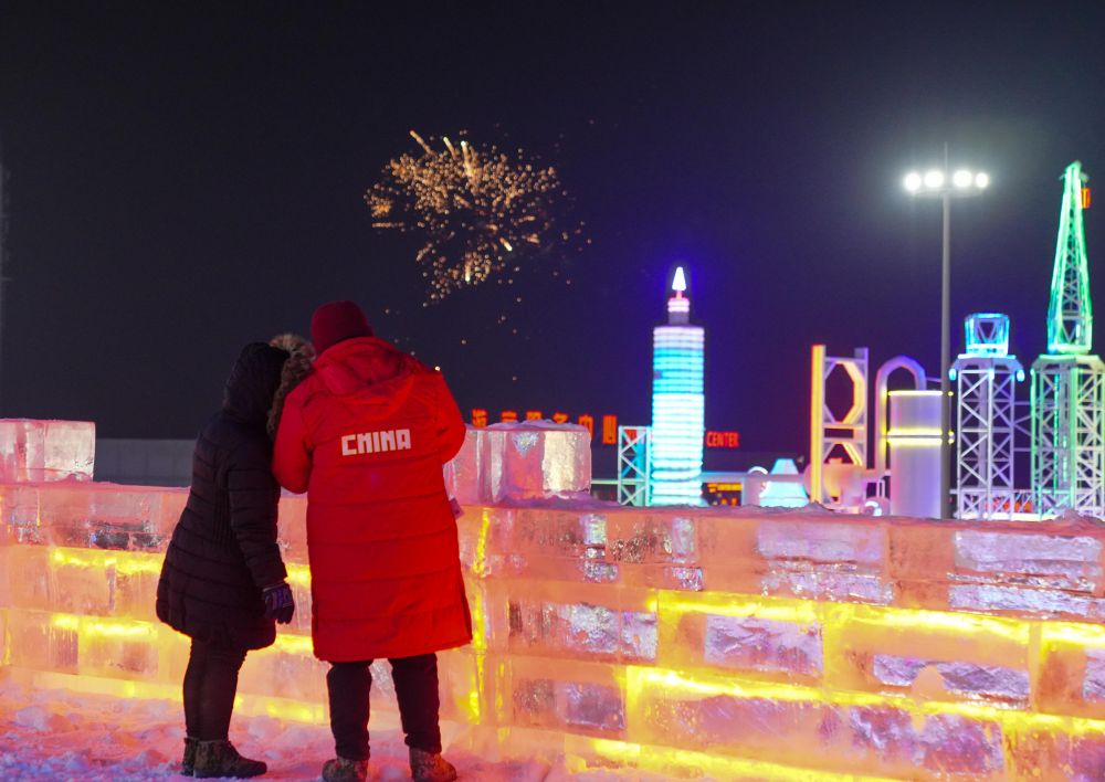 2022年12月28日,市民在长春冰雪新天地观看烟花。 新华社记者 王帆 摄