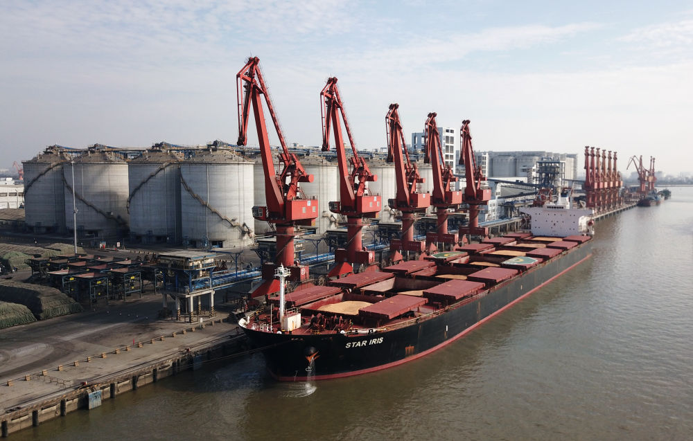 1月7日,载有6.8万吨巴西玉米的货轮抵达广东麻涌港。 新华社记者 黄国保 摄