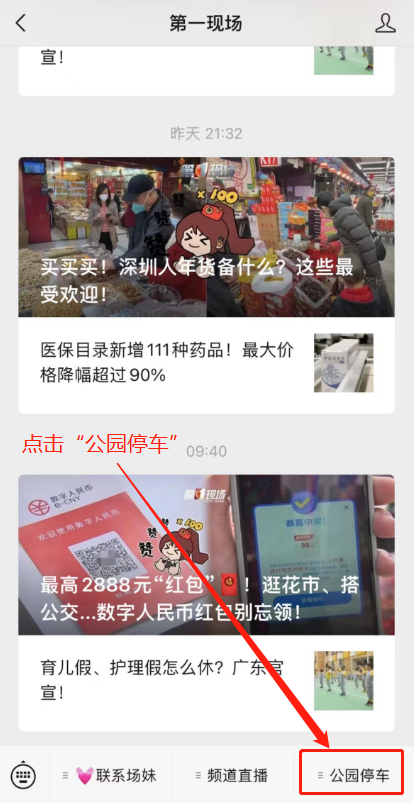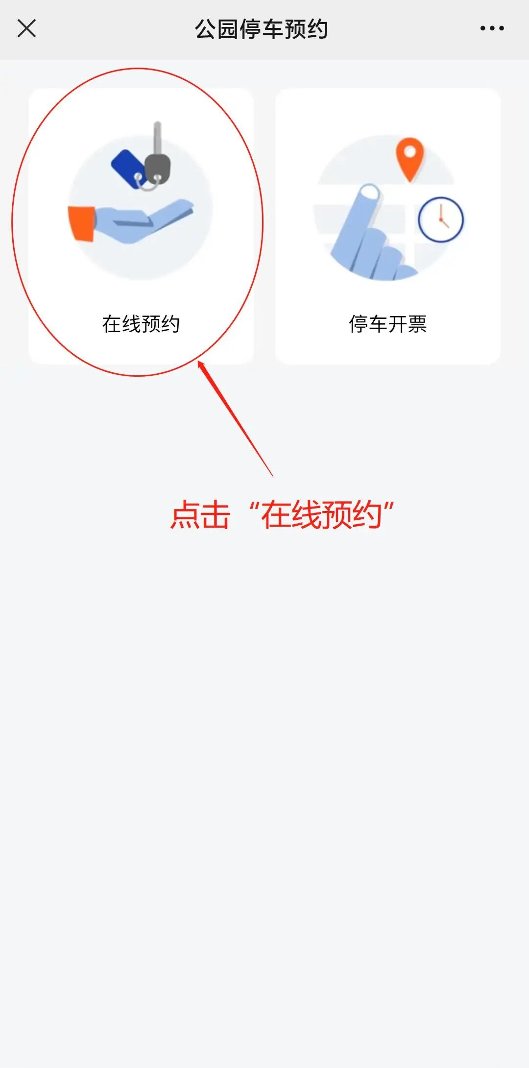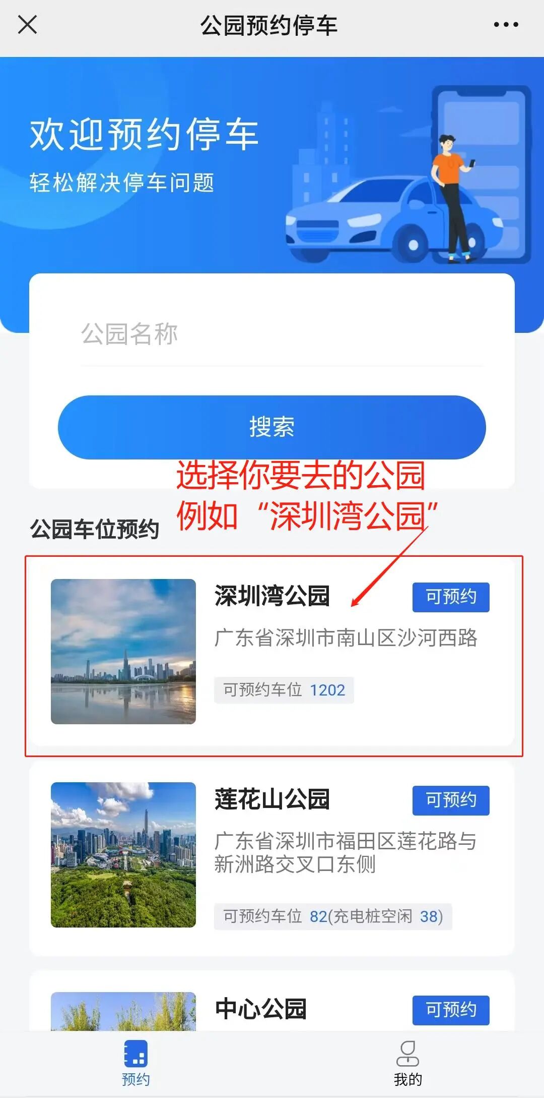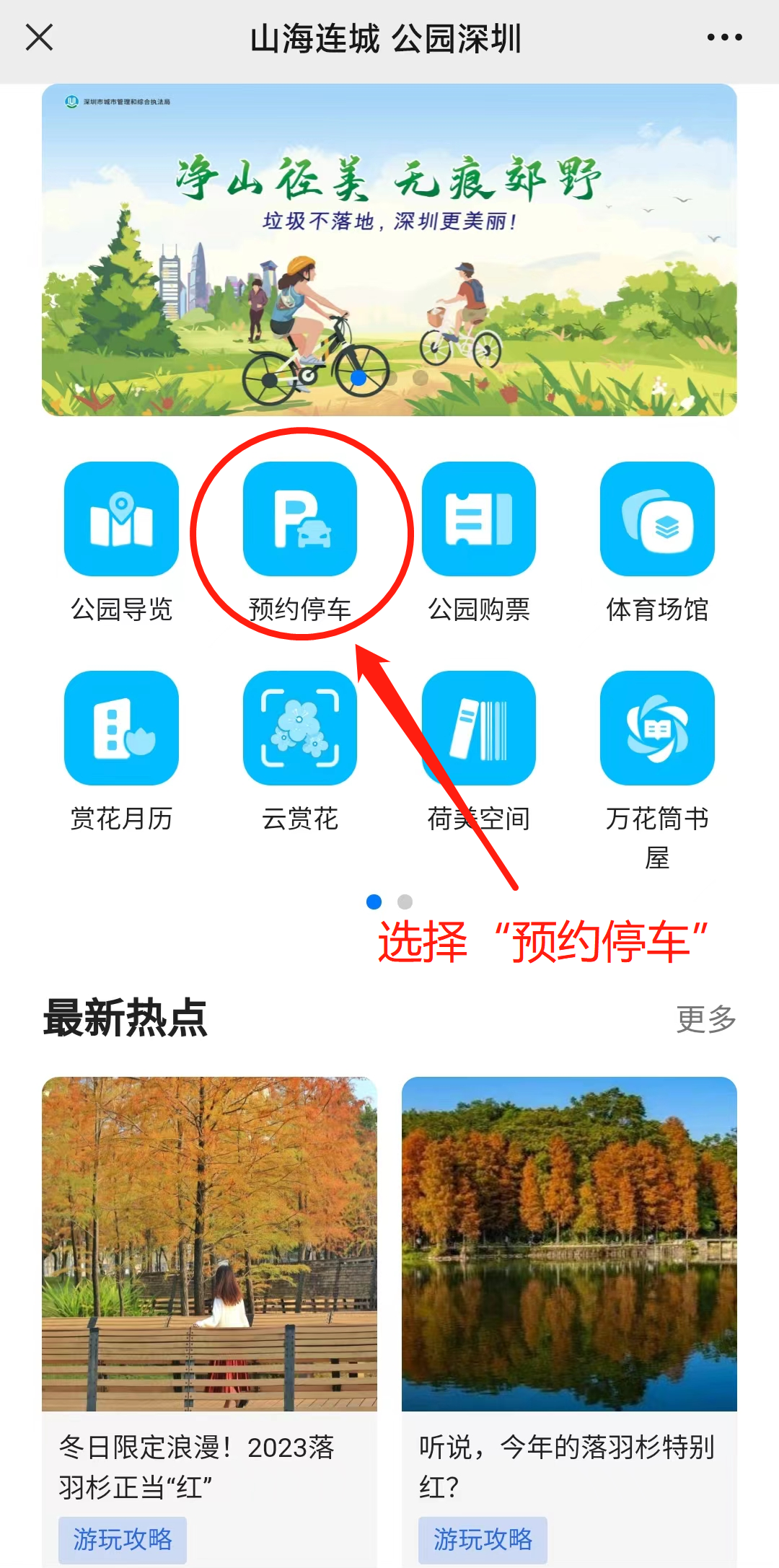步骤二:点击下方位置“公园停车”,进入预约入口后,点击“预约停车”。