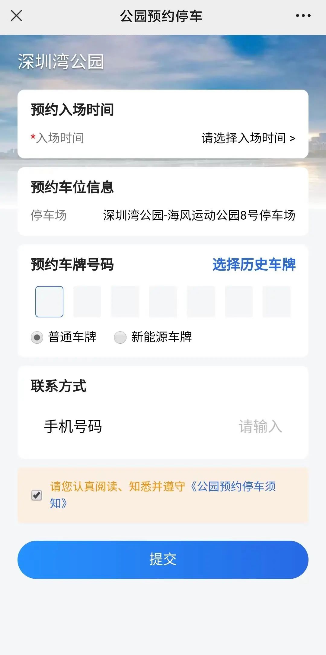 步骤四:选择预约入场时间(最长可提前2小时预约)、输入车牌、手机号码,提交即可。