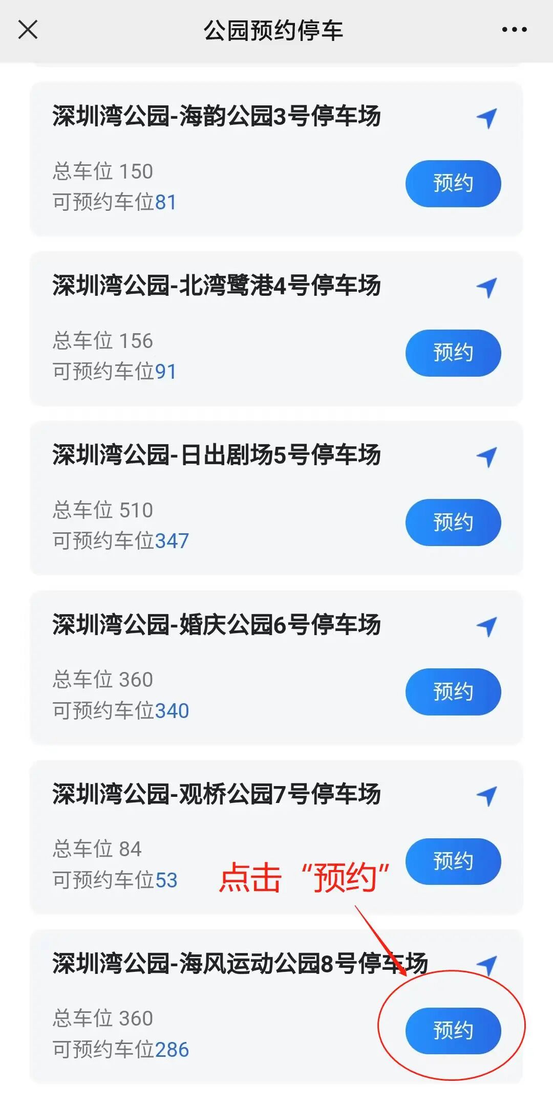 步骤三:点击“在线预约”选择需要预约的公园停车场,例如“深圳湾公园”。