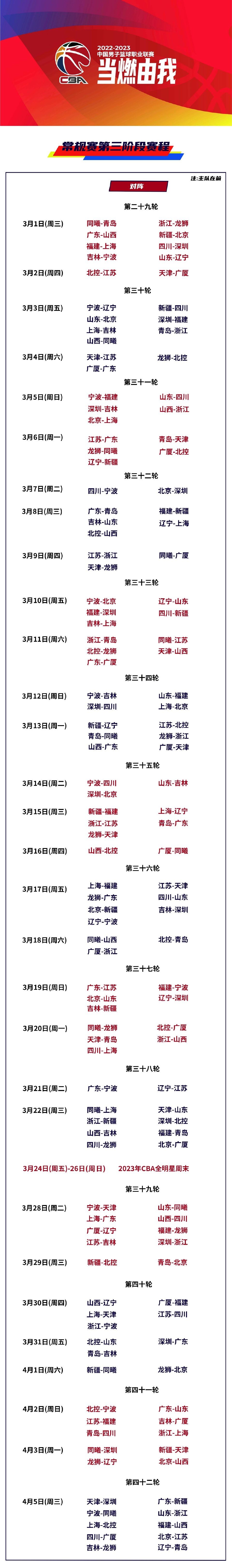 (原标题《2022-2023赛季CBA常规赛第三阶段赛程公布》)