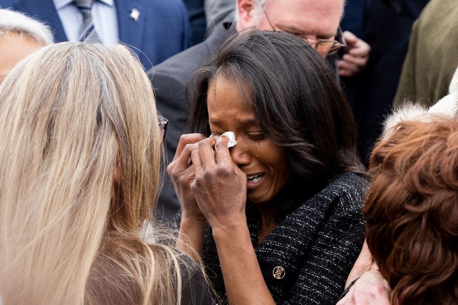 1月6日,在美国首都华盛顿的国会大厦外,一名前国会警察遗孀在纪念“国会山骚乱”两周年纪念仪式上流泪。新华社记者 刘杰 摄