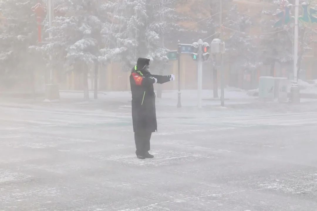 极寒天气使得空气中的水汽凝华而常常出现极端冰雾天气,能见度最低时不足10米,每天早晨交警都冒着零下50℃的极端低温,上道疏导交通。