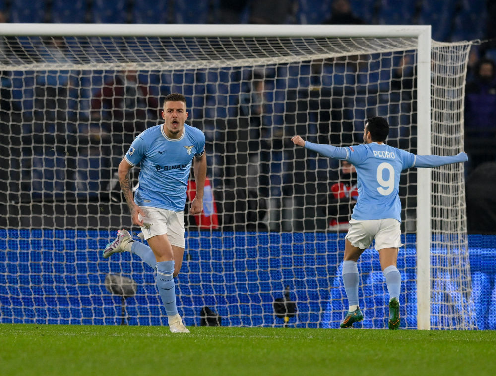1月24日,拉齐奥队球员米林科维奇-萨维奇(左)进球后庆祝。新华社发(奥古斯托·卡萨索利摄)