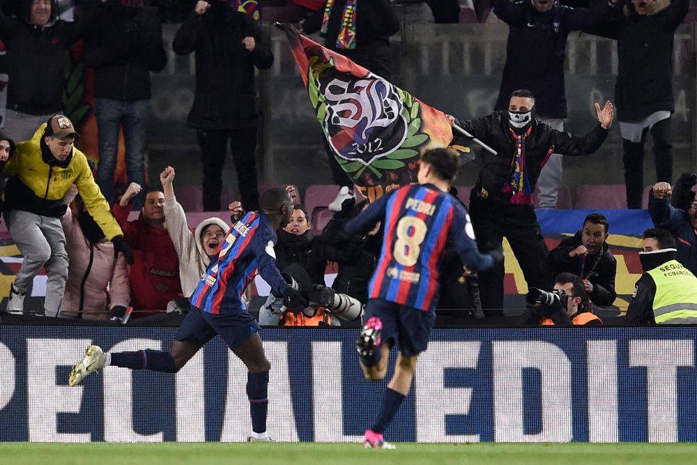 1月25日,巴塞罗那队球员登贝莱(左)在比赛中庆祝进球。新华社/法新