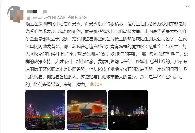 “好壮观!充满现代感、科技味十足,特‘深圳’。”20多岁的深圳白领龙小姐自豪地表示,“灯光秀真的给深圳市民带来了满满的幸福感!”