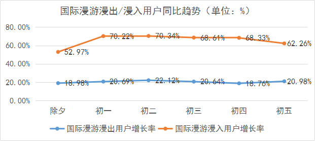 中国联通大数据显示,春节期间国际漫游漫出用户日均同比增加20%左右,漫入用户同比增加65%以上。探亲访友、旅游观光等需求释放,大幅增加了跨境人员流动。