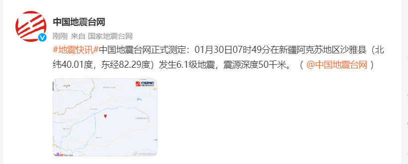 中国地震台网正式测定:1月30日7时49分在新疆阿克苏地区沙雅县(北纬40.01度,东经82.29度)发生6.1级地震,震源深度50千米。