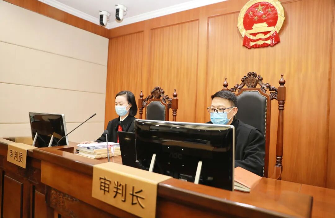 ▲图为庭审现场。人民陪审员、公诉人、被告人、辩护人在线参与庭审