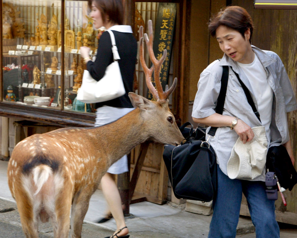 一只梅花鹿在日本奈良东大寺前从经过的行人挎包中寻找食品。新华社记者 冯武勇 摄