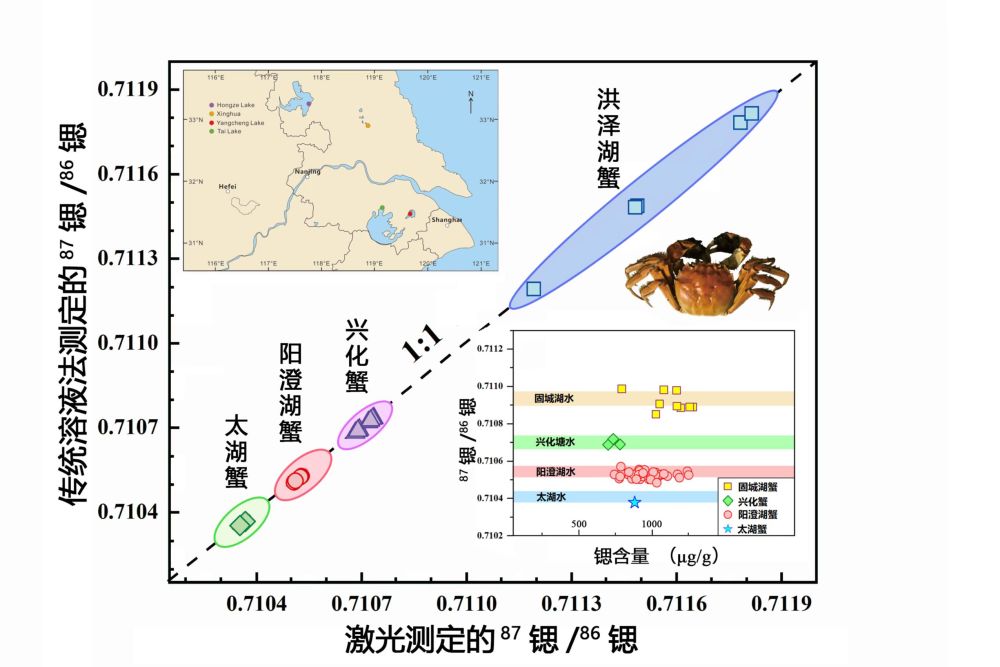 “锶在自然界中有4种稳定的同位素,其中‘锶87’和‘锶86’在不同地质环境中的相对含量不同,而这种同位素特征又会通过水和食物传递到生物体内。”于慧敏说,团队采集了阳澄湖、太湖、固城湖和江苏兴化等地湖区的大闸蟹,分析结果显示,来自同一湖区大闸蟹的锶同位素成分相同,而不同湖区的大闸蟹则显著不同。蟹壳中的锶同位素特征来自生长期,短期的“换水洗澡”无法改变。