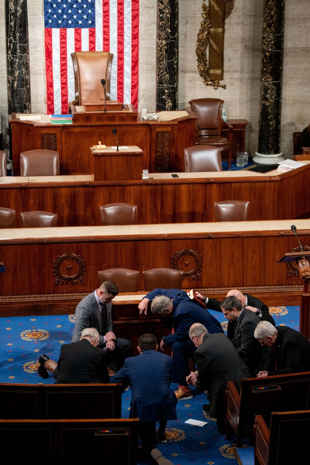 1月6日,在美国华盛顿国会,一些议员在众议院议长选举表决前祈祷。经过党内激烈争论达成利益交换,共和党众议员凯文·麦卡锡于7日凌晨在第15轮众议院议长选举表决中当选议长。新华社记者 刘杰 摄